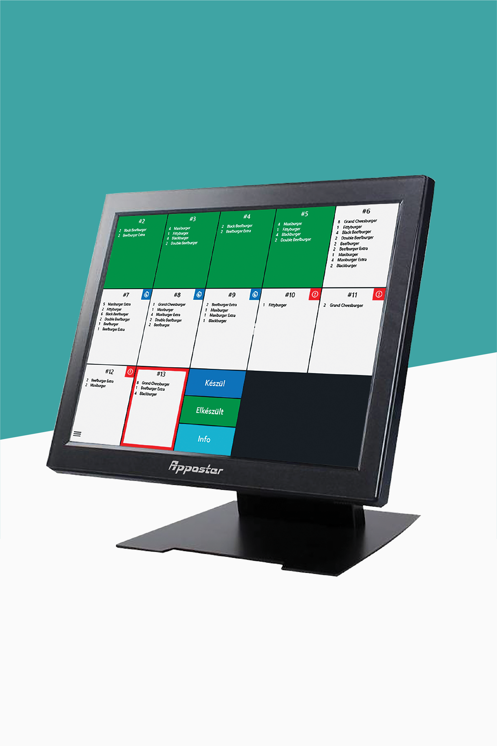 Modern, digitális konyhai rendeléskövető megoldás, amely valós időben jeleníti meg a rögzített vagy továbbított rendeléseket. A rendszer célja, hogy átláthatóbbá, gyorsabbá és hibamentessé tegye a munkafolyamatokat, miközben tehermentesíti a személyzetet.
